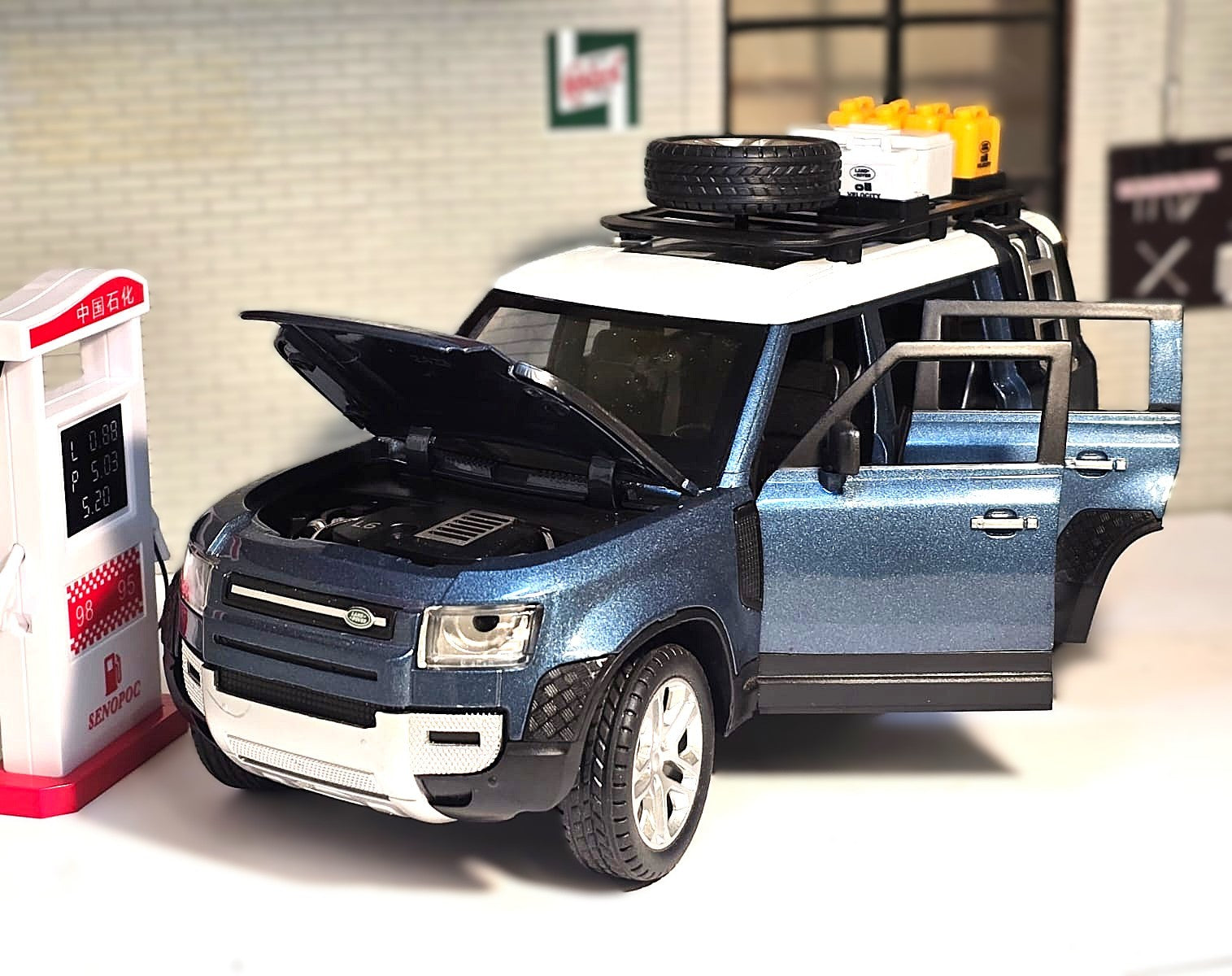 The tailgate/rear door opens along with the filler cap and side saddle box! Functioning suspension, pull-back action and opening the front doors switches the lights on.